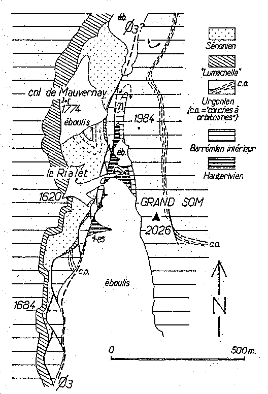 La particularité la plus saillante de ce secteur est de montrer sans équivoque que cette lame du Rialet se raccorde anticlinalement à l'Urgonien, à l'endroit, du compartiment chevauchant, ce dernier constituant le sommet du Grand Som (fig.16). Cela est attesté par la présence d'une charnière en genou, visible dans l'Hauterivien des hauts ravins, à l'E du point 1620, ainsi que par le raccord en continu des deux falaises d'Urgonien, autour d'un coeur de Barrémien inférieur, à l'E-NE du col de Mauvernay. En outre une assez large charnière synclinale (avec schistosité en éventail) affecte le Sénonien affleurant à l'W de la lame d'Urgonien, dans le versant S de l'arête qui s'élève du col de Mauvernay vers le sommet du Grand Som.