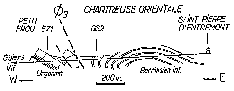 Fig.3 : Coupe synthétique du chevauchement chartreux occidental , dans le versant S (rive gauche) des gorges du Guiers Mort, montrant notamment les rapports entre la zone de chevauchement ( Ø1 ) et l'anticlinal de Fourvoirie.