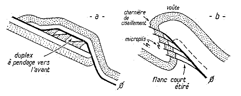 a : Le schéma des duplex à pendage vers l'avant, formés sous un chevauche ment majeur après dépassement du secteur soumis ultérieurement à l'écaillage.