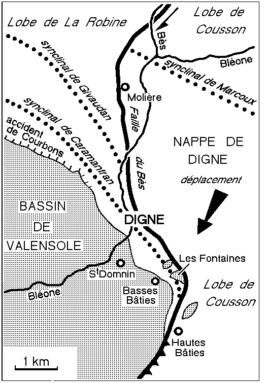 1. CADRE STRUCTURAL. - À Digne même, les terrains jurassiques et triasiques se rattachent au lobe de La Robine, portion de la nappe séparée du corps principal (ou lobe de Cousson) par la faille du Bès (fig.1 et 3). En fait ce n'est qu'à l'E de cet accident, à partir d'un point situé 2 km au SE de la ville de Digne, que le Mésozoïque (appartenant au lobe de Cousson) repose par charriage à plat, vers le S, sur le remplissage tertiaire du bassin de Valensole. A l'W de la déchirure de la faille du Bès, au contraire, la surface de charriage basale du lobe de La Robine s'enfonce en profondeur dans le remplissage autochtone du bassin de Valensole [1]. ? l'W de la Bléone et de la ville de Digne une faille à fort pendage (l'"accident de Courbons", fig.1 et 3) sépare le Mésozoïque charrié du Tertiaire autochtone, mais ce n'est qu'un accident secondaire qui a joué après le bloquage du front de la nappe. C'est l'écrasement des parties émergentes du lobe de La Robine contre cet accident qui explique la formation de plis serrés qui sont l'apanage de cette partie de la nappe [1].