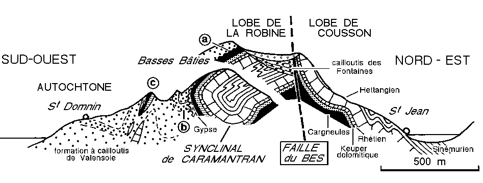 (b) As the lateral ramp of the Cousson lobe, the Bès fault allowed the former to move southward, both downward and obliquely with respect to the La Robine folded bulge. The latter was thus overturned upon the Cousson lobe which behaved as another, more internal, indenter (fig.3 and 4).