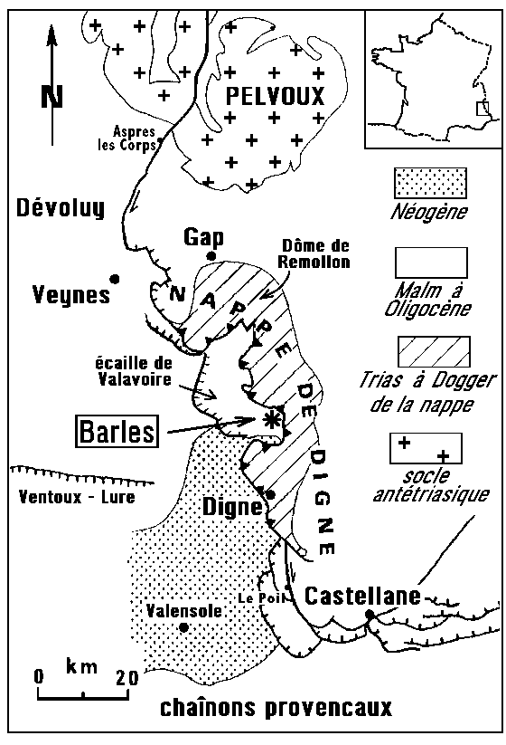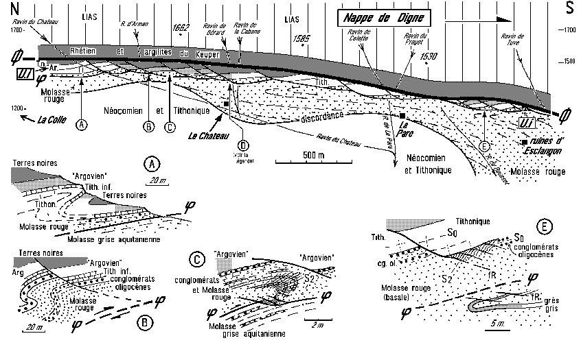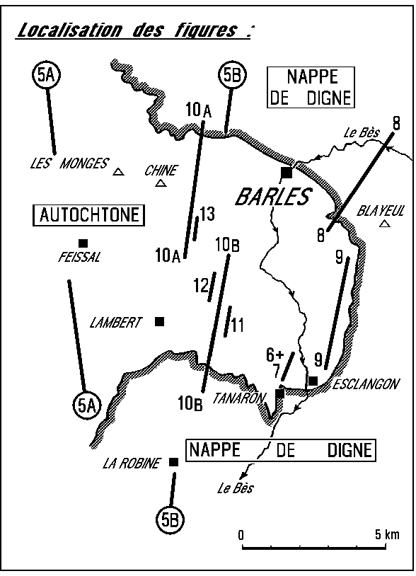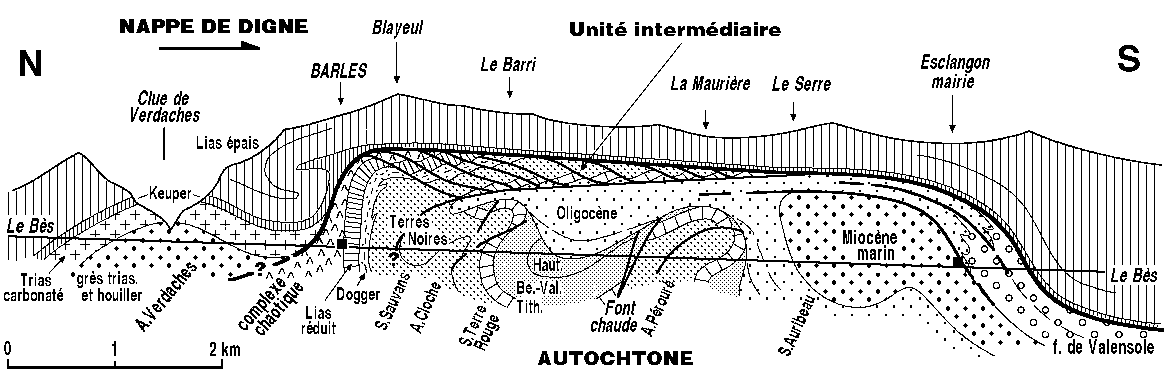 Il faut remarquer que la coutume s'est imposée depuis plusieurs décennies de considérer que la nappe de Digne est caractérisée par sa série à Lias-Dogger épais, qui l'oppose de façon frappante à son "autochtone" (fig.2). Cette notion d'autochtone est donc toute relative car plusieurs chevauchements sont aussi présents dans les domaines à séries Lias-Dogger réduit, dits "autochtones", même s'ils sont effectivement d'une ampleur visiblement plus modeste. Ici (comme souvent ailleurs aussi) l'emploi du mot "autochtone" ne signifie donc pas qu'il n'y a pas eu de transport tangentiel. Les remarques de FRY (1979) sur la diffusion du transport tectonique entre de multiples chevauchements (notamment dans les secteurs plus septentrionaux) sont pertinentes, même s'il n'est pas toujours possible de suivre cet auteur dans son analyse des structures locales (pour plus de détails sur celles-ci voir GIDON et al., 1992).