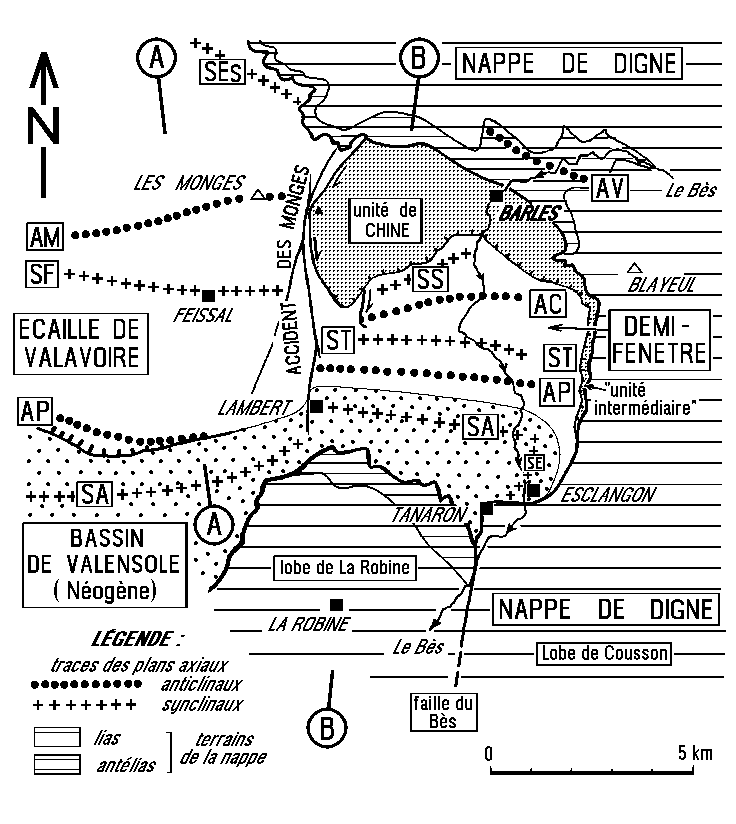 3 - À la fin du Pliocène, donc bien après la principale étape de mise en place de la nappe et sans doute après une phase d'interruption mio-pliocène, sont intervenus des mouvements ultimes de la nappe. Ils sont à l'origine des plis frontaux du Lobe de la Robine, de la déchirure de la faille du Bès et des chevauchements visibles au S de Digne. C'est la prise en compte de ces derniers mouvements qui permet aussi d'expliquer de façon satisfaisante les particularités géométriques de la région de Barles.