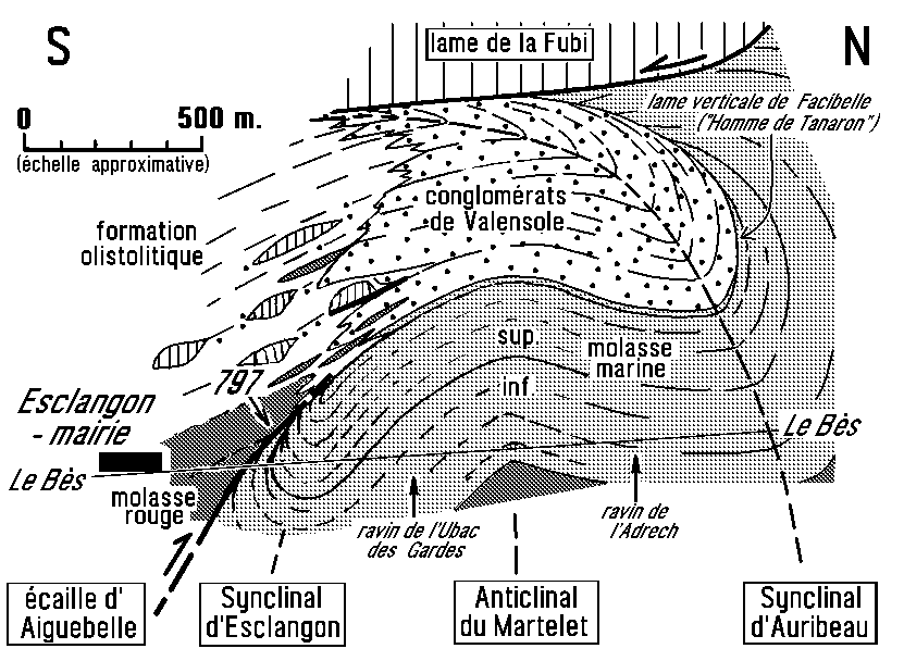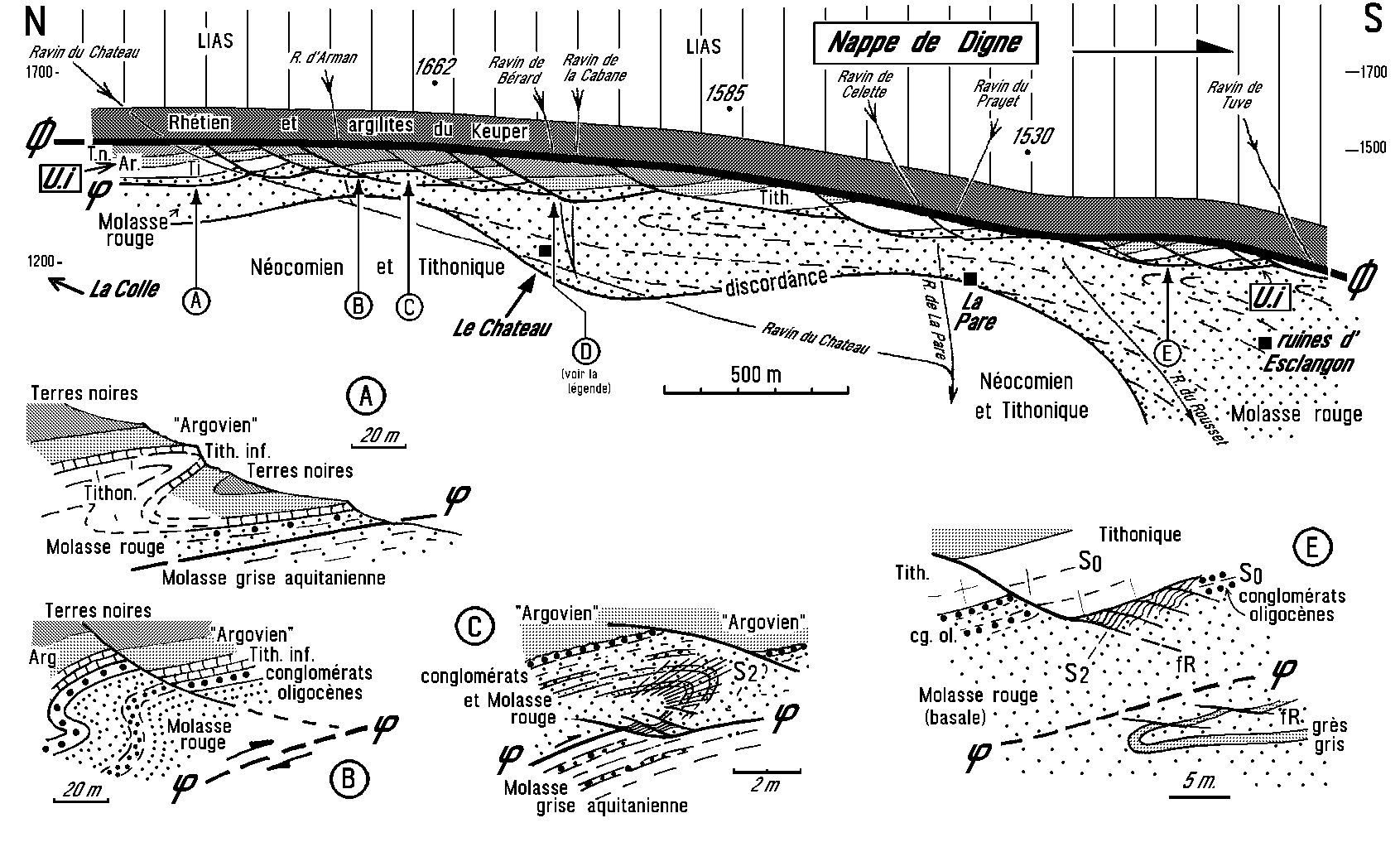 La fin du dépôt du miocène marin, récemment datée ici même du Langhien terminal (CRUMEYROLLE et al, 1991) coïncide là avec la rupture du flanc E du synclinal d'Esclangon, ce qui se traduit par le chevauchement vers le NW d'une "écaille d'Aiguebelle" [GIDON, 1989] (= [pro parte] "écaille d'Esclangon" [HACCARD et al., 1989]) à matériel de Molasse rouge autochtone. Le front de cette unité se dilacère vers le NW, en olistolites, dans les premières couches continentales pour constituer ici une "formation olistolitique", qui s'imbrique ou passe latéralement vers le NW (dès ses niveaux inférieurs) à la formation conglomératique de Valensole [PAIRIS & GIDON, 1987]. L'origine sud-orientale des apports, qui persiste d'ailleurs dans toute la formation olistolitique, est confirmée à la fois par les particularités stratigraphiques de plusieurs olistolites, qui n'autorisent pas à leur accorder une origine septentrionale, et par l'association de certains autres à des microstructures intraformationnelles à vergence W à NW [PAIRIS & GIDON, 1987].