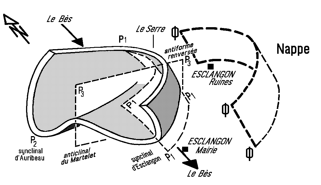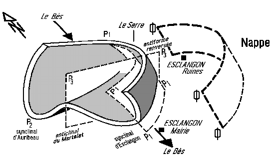 D'autre part ce n'est qu'entre Tanaron et les ruines de l'ancien village d'Esclangon (donc essentiellement en rive gauche du Bès), que s'observe réellement la voussure de la base de la nappe et que cette dernière aboutit à des pendages vraiment forts. On voit là que ce pli de la nappe ne fait que suivre la structure antiforme, fortement plongeante vers l'E, du Miocène marin renversé de l'autochtone (fig.4), dont elle n'est pas séparée par des conglomérats de Valensole. Cette antiforme résulte, comme on l'a vu plus haut, de l'enroulement d'un synclinal d'axe SW-NE, le synclinal d'Esclangon, autour d'un repli N130°, l'"anticlinal du Martelet" (fig.6 et fig.7).