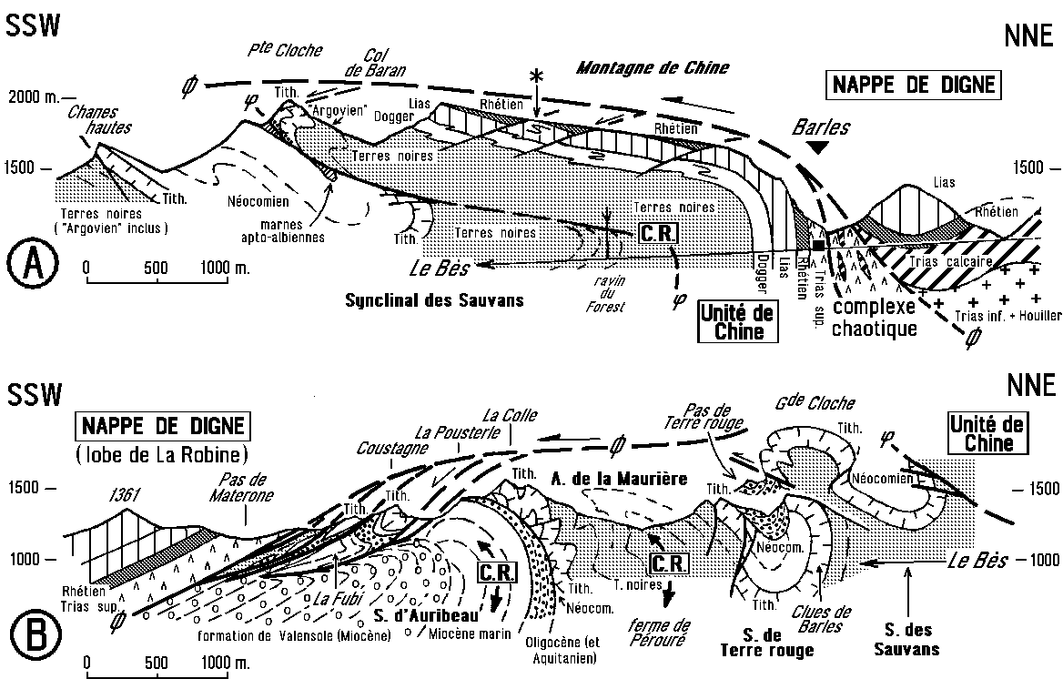Son tracé cartographique est assez différent de celui adopté par la feuille LA JAVIE (tracé qui correspond en fait à une faille restée cachetée depuis l'Oligocène [GIDON, 1982]). Une cartographie des divers niveaux stratigraphiques des Terres noires conduit en effet à localiser ce chevauchement beaucoup plus au NE, et à lui faire franchir le Bès moins de 1,5 km au SW de Barles : en effet on le repère en rive droite du Bès, dans le ravin du Forest, où il fait reposer du Callovien renversé sur de l'Oxfordien à l'endroit qui se rebrousse en crochon (fig.10A). Il en découle que cette surface de chevauchement décrit le même ploiement antiforme que le reste de l'unité elle-même : bien loin de rejoindre vers le N la surface de chevauchement de la nappe pour s'y connecter, le chevauchement de l'Unité de Chine se prolonge donc sans doute en profondeur vers le S (fig.10A).
