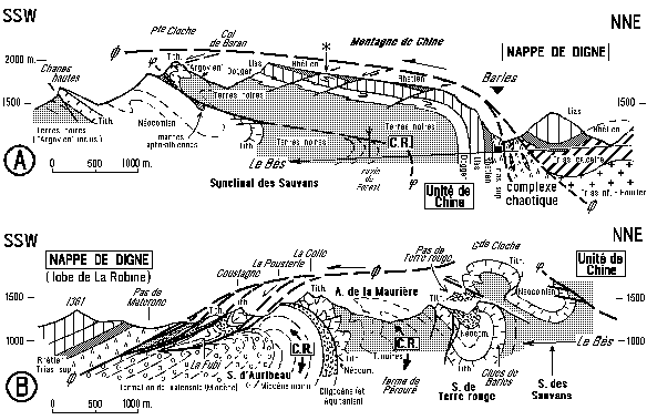 L'interprétation de ce dispositif est certainement à rechercher dans ce fait remarquable que le prisme délimité par la rampe profonde (constitué au moins de Houiller et de Trias), a buté ici contre la marge N de l'Unité de Chine, au terme de sa progression vers le S (fig.14) : il n'a ni sectionné celle-ci, qui était pourtant déjà rebroussée en un pli couché (fig.15B et C) ni avancé plus loin en la chevauchant (comme le faisait auparavant la dalle de la série post-triasique, plus flexible et qui glissait en outre sur le niveau de décollement du Trias supérieur). Ce prisme profond, dont seul le bord d'attaque méridional s'est légèrement infléchi vers le haut, n'a donc pu progresser qu'en repoussant devant lui la charnière de Chine. Il l'a fait par l'intermédiaire du complexe chaotique de Barles, qui s'est sans doute formé à cette occasion (fig.15C et D) par bourrage dans l'espace ouvert par l'inflexion vers le haut ainsi infligée à la surface de charriage. L'attitude actuelle du flanc vertical de la série de Chine et celle, également très redressée, de la surface de charriage trouvent donc leur explication dans la déformation en compression horizontale qui en est résultée.