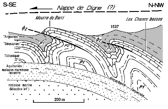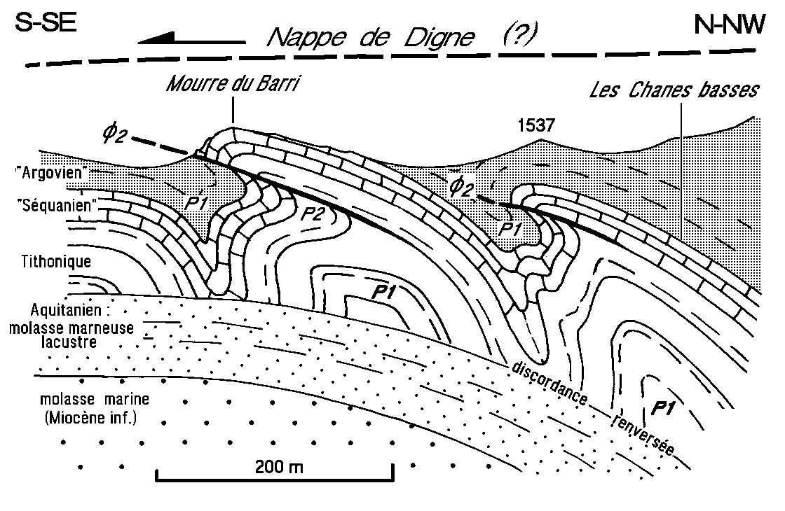 Il avait été admis [GRANDJACQUET et al., 1972, GIGOT et al., 1974a ; HACCARD et al., 1989] qu'il y avait dans cette région une discordance des terrains néogènes sur les molasses rouges de l'Oligocène, plissées et schistosées. De fait les terrains tertiaires des synclinaux plus septentrionaux que celui d'Auribeau sont seulement des molasses continentales oligocènes et aquitaniennne. Mais si les termes aquitaniens de ces dernières s'y appuient parfois directement sur des terrains anté-cénozoïques cela n'est du qu'à un onlap de la série sur des reliefs structuraux hérités de la phase de plissement anté-oligocène. Cette disposition, très bien caractérisée, a pour résultat que seuls les termes élevés de la succession ont ennoyé les voûtes anticlinales (fig.6). D'autre part les plis décamétriques qui se rencontrent par place dans les molasses rouges (notamment au nord et au sud des ruines d'Esclangon) ne sont pas cachetés par l'Aquitanien mais s'y amortissent par plissement disharmonique [GIDON, 1989]. Enfin la schistosité de plan axial des plis post-oligocènes ne saurait être anté-aquitanienne : en effet on l'observe encore dans les molasses marneuses aquitaniennes, jusqu'à la base des molasses très calcaires du Miocène marin et même, plus haut, dans les niveaux miocènes les plus marneux (sa disparition apparente vers le haut n'est donc due qu'aux changements de nature de la roche). En définitive rien ne justifie donc de distinguer une phase anté-aquitanienne de plissement.