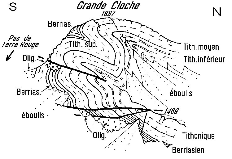 - des failles subverticales, ou à pendage SE plus ou moins fort, d'azimut NNE et à rejet dextre. En fait ces fractures, porteuses aussi de stries N210° inclinées en moyenne de 30° vers le SSW, passent latéralement, en continu par réduction de leur pendage, aux Riedels de la nappe. Cela indique que le cisaillement qui les a induit comportait une composante de mouvement coulissant subhorizontal ("décrochevauchement") par rapport à la surface basale, inclinée vers l'E, de la nappe. Ce mouvement latéral semble d'ailleurs prendre souvent le pas sur le mouvement tangentiel, par exemple dans les ravins situés immédiatement au SE de la Colle du Chateau, où précisément la surface de charriage s'infléchit autour de la voûte de l'anticlinal de la Grande Cloche (indiquant par là que cette dernière devait constituer un relief lors de la progression de la nappe).