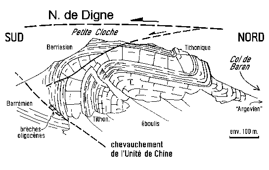 Or de nombreuses failles normales cachetées par l'Oligocène puis pliées par les serrages ultérieurs sont connues dans ce secteur [GIDON, 1982]. D'autre part il est de fait qu'à l'Oligocène l'Unité de Chine semble avoir constitué un domaine relativement surélevé par rapport à celui qu'elle chevauche maintenant. En effet les témoins de conglomérats de la molasse rouge y transgressent en général sur des terrains plus anciens que ceux présents sous son chevauchement. Par exemple, à la Petite Cloche (fig.13) ces conglomérats sont en contact stratigraphique direct sur le Tithonique (le tout étant renversé) alors que l'Apto-albien est présent, sous des conglomérats analogues, dans le compartiment chevauché. De même, à la Colle du Chateau (en rive gauche du Bès), des molasses rouges directement transgressives sur les Terres noires (et renversées avec elles) chevauchent en plusieurs points des conglomérats autochtones qui reposent au contraire sur du Berriasien.