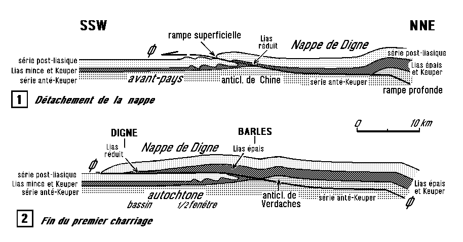 A previous step of deformation is also documented. It consisted in a strong horizontal tightening of the cover, which characterises the Barles half-window with respect to the more western Valavoire thrust plate. This was favoured by a dextral motion, contemporaneous with the Digne thrust first motion, along the "Monges fault". This first deformation was followed or, more likely, combined with a tangential shear, acting a few hundred meters above the Bès valley level. Their effect was a southward overturning of the upper part of every fold, particularly of the Chine series and of the northern margin of the Valensole neogene basin which was progressively turned into a wide recumbent fold during the deposition of the Miocene sequences, until the very nappe's first emplacement occurred. These movements could therefore be considered as preliminary ones in a progressive phenomenon which began as early as the lower Miocene and ended during upper Miocene with the nappe's decollement and emplacement.