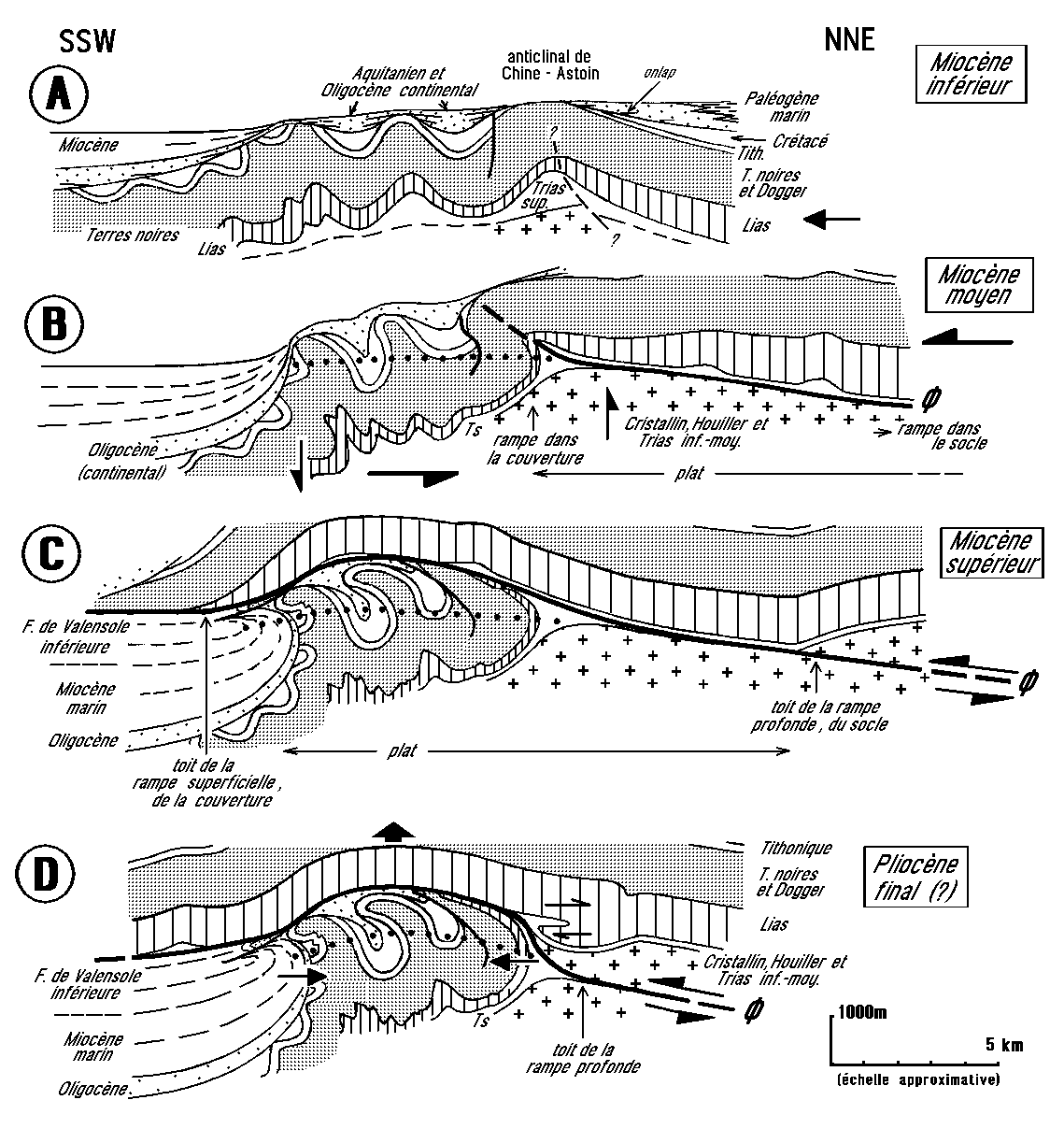 La déformation qui a préludé au début du charriage proprement dit est vraisemblablement interprétable en termes de chevauchement profond affectant la seule tranche antéliasique de la série de la nappe ("blind thrust"), la tranche supérieure ne subissant qu'un raccourcissement par plissement, jusqu'à ce qu'un accroissement suffisant du déplacement sur la rampe profonde provoque sa déchirure par rupture de la charnière de l'anticlinal de Chine [GIDON, 1989] (fig.14 et 15B et C).