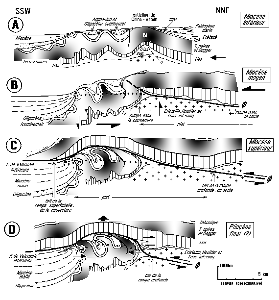 Elle débute, dès le début du Miocène marin, par de spectaculaires biseaux de discordance progressive. Ces biseaux se fermaient initialement vers le SE (avant leur renversement) et s'inscrivent donc dans un rebroussement progressif des couches vers le NW, autour de l'axe SW-NE d'un "synclinal d'Esclangon" (fig.6). Il faut évidemment les interpréter comme le résultat d'un basculement vers l'W-NW de la marge E du bassin.