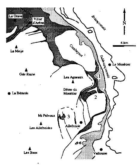 Figure 1 - Carte schématique de la bordure orientale du Massif des Ecrins-Pelvoux. Grisé clair: nummulitique, grisé sombre: Mésozoïque.
