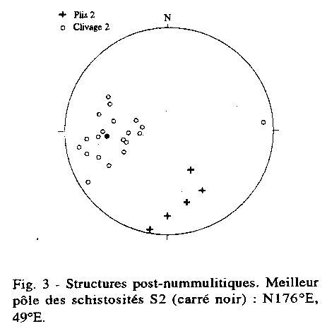 Fig. 3 - Structures post-nummulitiques. Meilleur pôle des schistosités S2 (carré noir): N176°E, 49°E.