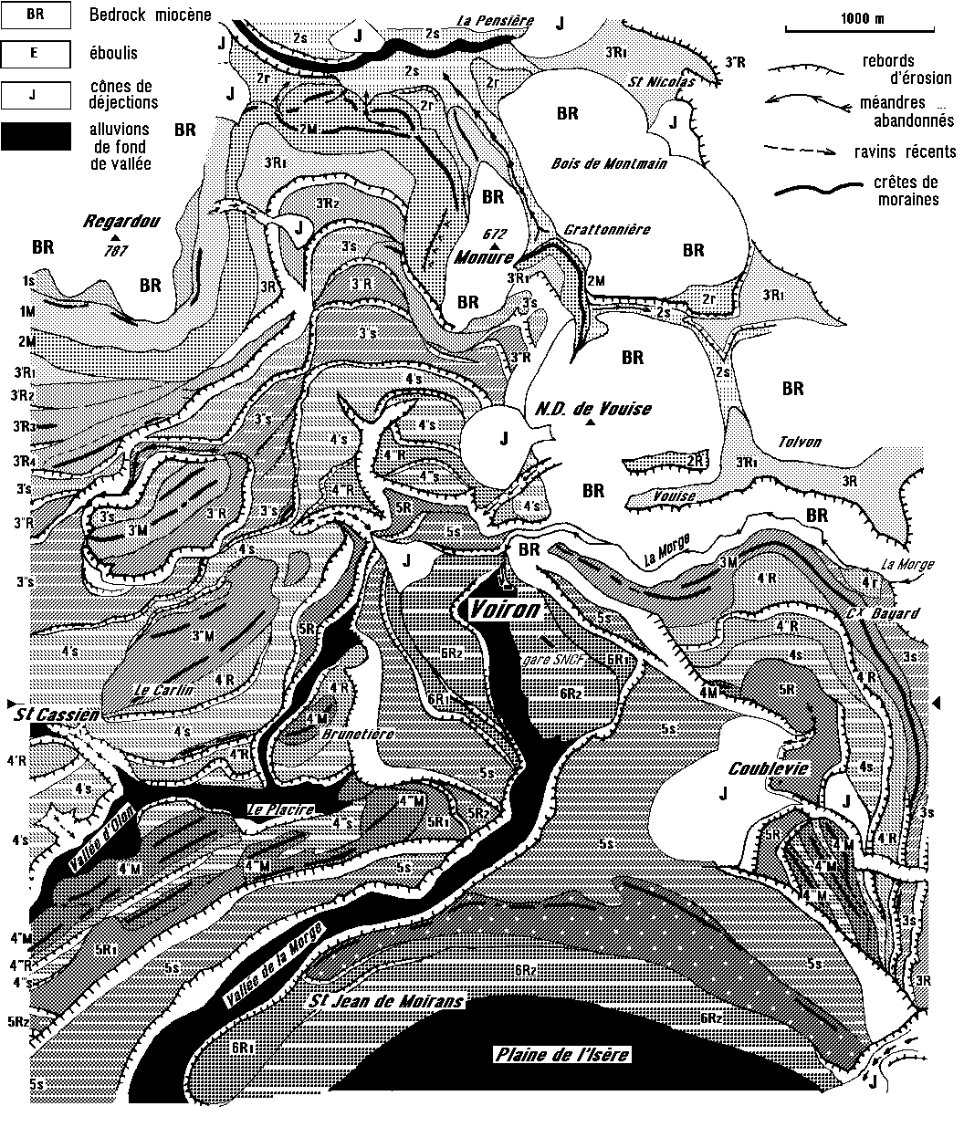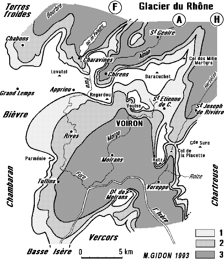 Le Voironnais est connu de longue date pour avoir finement enregistré les étapes d'érosion et de dépôt contemporaines du retrait du glacier isérois du Würm II, notamment dans sa partie ouest ou "seuil de Rives", qu'entaille la vallée de la Fure (BLANCHARD, 1912 ; BOURDIER, 1961). Le système morphologique qui régit, dans tout le Bas Dauphiné, le relief périglaciaire a déjà été exposé antérieurement (GIDON et al., 1968a et 1968b) ; les principes des corrélations chronologiques qu'il permet d'établir entre ses diverses formes ont d'ailleurs été appliqués au lever et au dessin de la feuille Voiron de la carte géologique à 1/50.000° (GIDON & STEINFATT, 1970), puis de la 2° édition de la feuille Grenoble (GIDON & ARNAUD, 1978).
