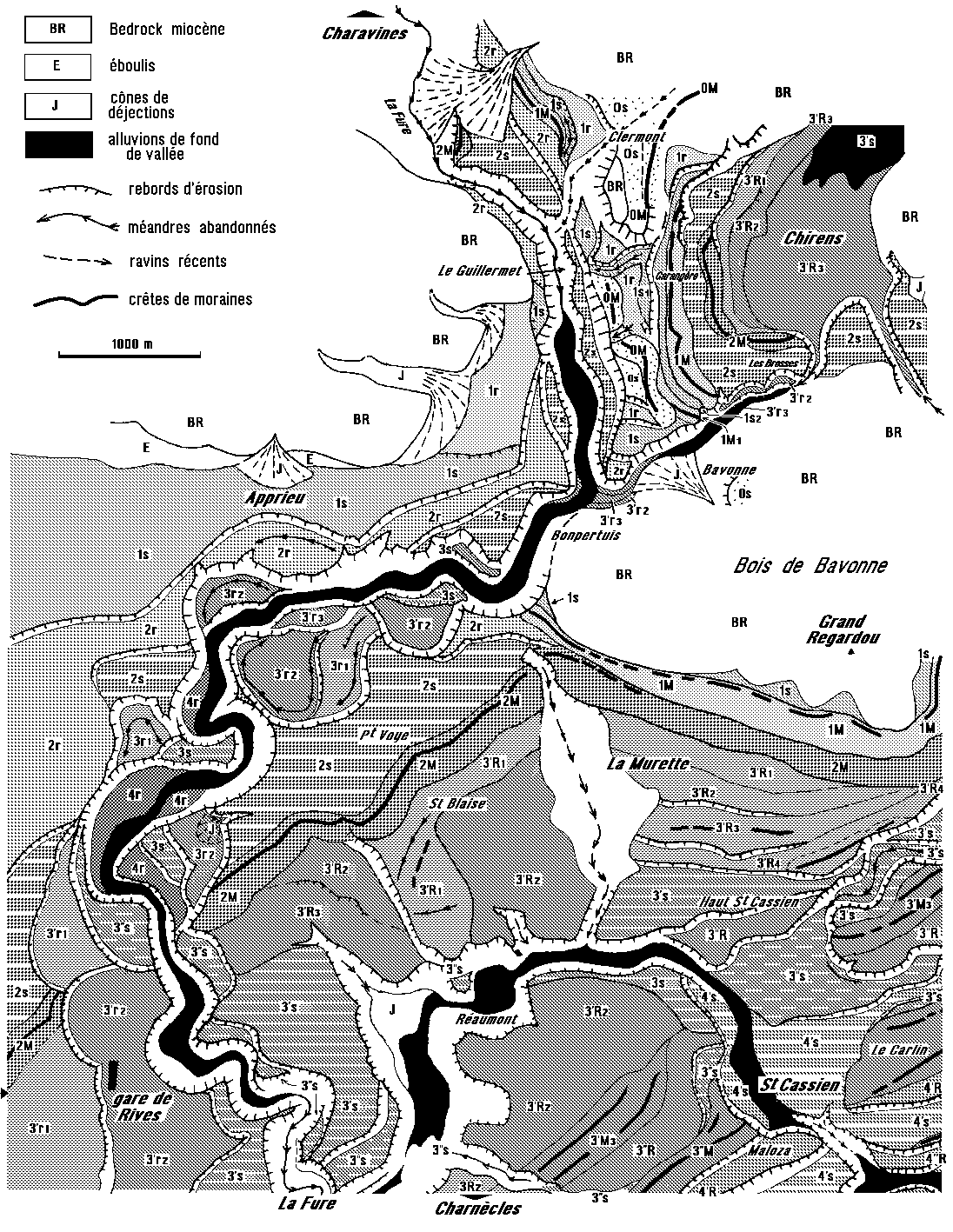 Il faut remarquer aussi que seules sont enregistrées, comme on le sait, les étapes de retrait qui n'ont pas été suivies d'une crue glaciaire qui ait fait revenir le glacier plus loin que le secteur alors abandonné : les autres ont été effacées par la recrue glaciaire. Il en résulte que, malgré une apparence d'enchaînement continu des formes emboîtées, l'enregistrement des étapes du retrait glaciaire est vraisemblablement discontinu, avec des hiatus non repérables. Toutefois l'existence d'un enchaînement réel des étapes parait ici bien établi en ce qui concerne les épisodes au sein d'un intervalle donné (notamment au sein de l'intervalle 3, par la progressivité des changements intervenus, surtout en ce qui concerne la migration des méandres de la Fure)