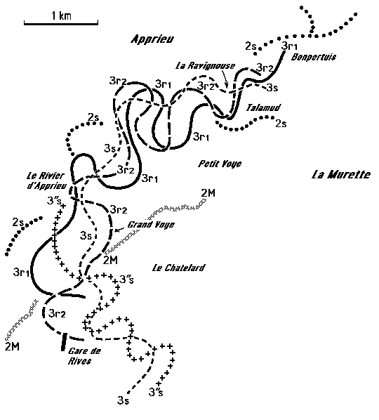 La cartographie des rebords de terrasse et des vallées mortes conservées dans la vallée de la Fure permet de reconstituer avec une grande précision le dessin des méandres qui se sont entaillés progressivement pendant le creusement de cette vallée(fig.4). On perçoit même assez clairement leur migration progressive vers l'aval, conformément au schéma le plus classique. Cette observation étaye l'idée d'une succession sans hiatus des épisodes repérés.