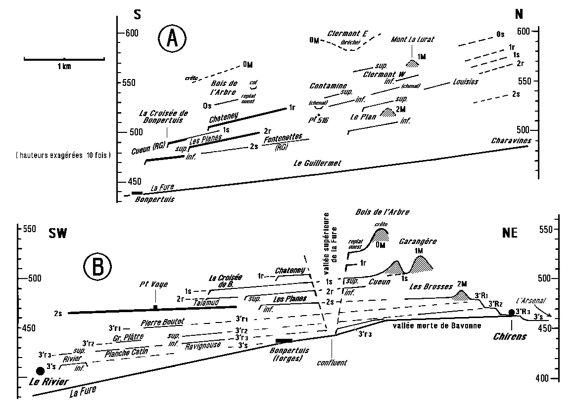 Les surfaces de chacune des deux rives sont projetées sur une même coupe passant selon l'axe moyen, nord-sud, de la vallée. L'échelle des hauteurs est exagérée 10 fois pour avoir une représentation assez précise des pentes (celles-ci n'atteignent en réalité que des valeurs de quelques unités pour mille). Ce sont les terrasses de rive droite, qui se poursuivent vers l'ouest jusqu'au delà d'Apprieu, (tiers gauche de la coupe : trait plus gras) qui servent de base de référence pour la numérotation chronologique. En effet elles sont parfaitement calées sur la succession d'évènements reconnaissables dans la marge du glacier isérois et, de plus, on en observe une large surface, suffisante pour bien pouvoir en préciser la pente.