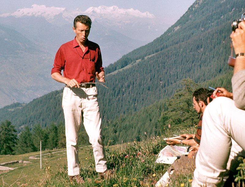 Jacques Debelmas "sur le terrain", en 1964, commentant le paysage du val d'Aoste devant un groupe d'étudiants