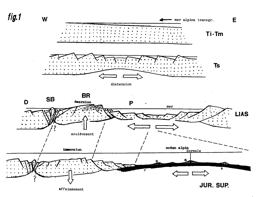 Au Lias, le champ distensif croît avec l'approche de la fissure. On voit apparaître, dans les futures zones internes alpines, un fossé d'effondrement (rift), dit piémontais (fig.1, P). Des sédiments marins d'eau plus profonde, s'y accumulent tandis que les bordures (« épaules » du rift) se soulèvent et émergent pour des raisons thermiques (l'amincissement de la lithosphère fait remonter le manteau : son flux thermique réchauffe et allège les épaules en question). Ainsi apparaît le horst briançonnais (BR) qui restera émergé jusqu'à la fin du Jurassique moyen. Ce horst traduit la dislocation des deux marges du rift en blocs juxtaposés qui, soulevés ou abaissés, vont commander désormais la paléogéographie du futur domaine alpin.