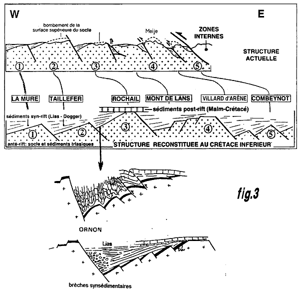 Les blocs faillés liasiques ont été très déformés par le plissement alpin sur les bordures immédiates du rift, futures zones internes, mais ils se retrouvent aussi dans l'actuelle zone externe, notamment dans les massifs cristallins externes (fig.3) où, moins déformés, ils permettent de bien visualiser le phénomène à ses débuts, et de connaître l'orientation de l'ancien rift, soit SW-NE (direction parfois dite « cévenole »).