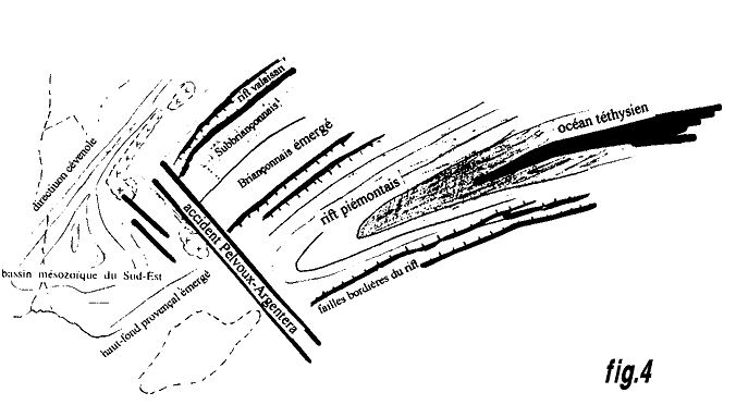 En effet la paléogéographie liasique du futur domaine alpin est différente de part et d'autre de cette ligne. A l'W, on a un bassin de subsidence triangulaire qui, aux approches de l'accident en question, est affecté de hauts fonds NW-SE. A l'E, au contraire, les blocs se disposent perpendiculairement à l'accident (fig. 4), comme le horst briançonnais, émergé, et un rift, dit valaisan, encore modeste mais que nous retrouverons au Crétacé.