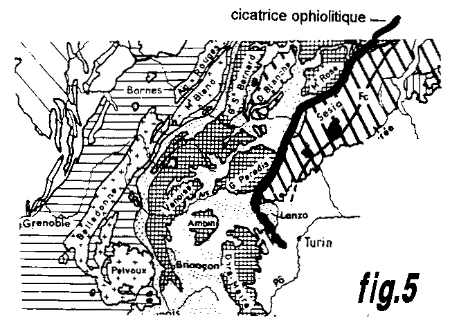 L'existence de cet océan est attestée par celle de massifs d'ophiolites dessinant grossièrement l'arc alpin même s'il s'agit de nappes dont l'origine (la « racine ») n'est pas très nette, probablement la zone d'écailles séparant l'ensemble Grand Paradis-Mont Rose de la zone Sesia (fig. 5). Les péridotites de Lanzo restent discutées : manteau sous-océanique ou manteau sous-jacent à la marge continentale sud de l'océan (marge sudalpine).