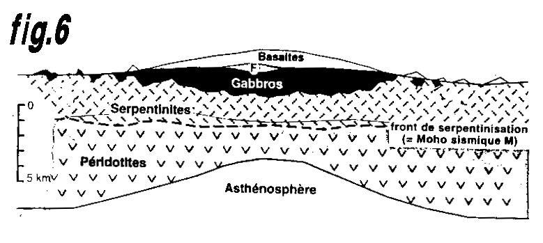On parle souvent de « trilogie ophiolitique » (péridotites serpentinisées, gabbro, basaltes). Elle est bien visible au Chenaillet, près du col du Montgenèvre, mais ce massif est un cas exceptionnel (fig. 6). Le plus souvent, les ophiolites alpines sont seulement des péridotites serpentinisées qui n'ont exsudé que très peu de gabbros (sous forme de filons ou de poches locales) et encore moins de basaltes. Ces caractères sont ceux de dorsales à expansion lente (0,5 à 1, parfois 2 cm/an) fréquentes dans l'Atlantique. Dans les dorsales rapides, de type Pacifique, on a 2 à 3 km de basaltes sur 4 à 5 de gabbros, avec une vitesse d'expansion de 10 à 15 cm/an.