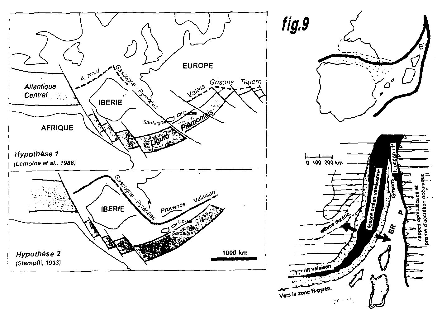 Ce schéma expliquerait que le Briançonnais ait l'air de se terminer en pointe entre les deux hiatus océaniques au niveau des Grisons (voir fig. 7). Mais il se heurte à l'absence totale de traces d'un sillon continu des Pyrénées au Valais à travers le SE de la France, ce qui est difficile à admettre vu le faible raccourcissement de ce domaine intermédiaire, alors que dans les Pyrénées et les Alpes, où le raccourcissement a été considérable, sillon nord-pyrénéen et sillon valaisan sont toujours déchiffrables. Le décrochement des Alpes occidentales, évoqué précédemment, n'est pas non plus pris en compte.