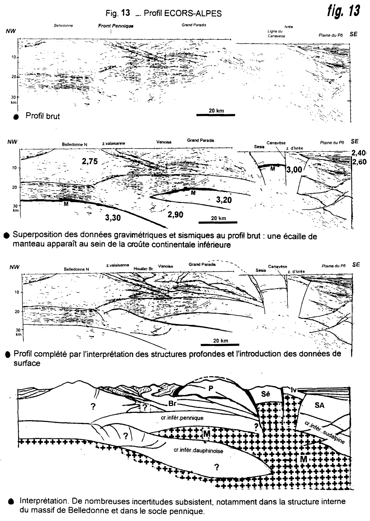 Cette coupe rassemble des informations tirées des études sismiques et gravimétriques. Elle confirme que, sur la transversale des Alpes franco-italiennes, le manteau se rapproche bien de la surface, provoquant une anomalie gravimétrique, la célèbre anomalie d'Ivrée, ce qui n'a rien d'étonnant puisque ce manteau affleure localement, au N de Turin, dans le massif péridotitique de Lanzo. Mais ce qui est plus intéressant, c'est l'existence d'une écaille mantellique chevauchante vers l'W, sous les zones internes, et d'un écaillage à vergence Est du manteau sous-apulien.