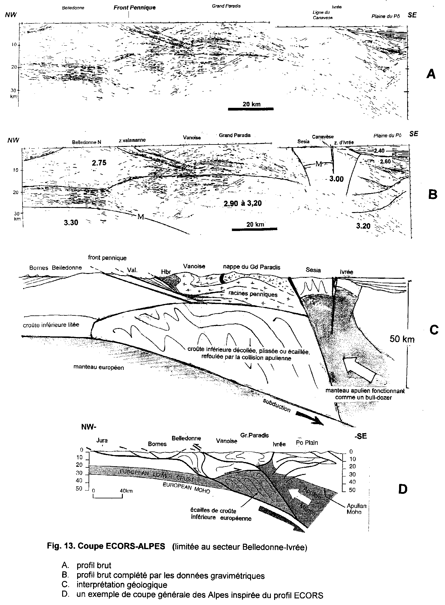 Cette coupe rassemble des informations tirées des études sismiques et gravimétriques. Elle confirme que, sur la transversale des Alpes franco-italiennes, le manteau apulien (=insubrien) se rapproche bien de la surface, provoquant une anomalie gravimétrique, la célèbre anomalie d'Ivrée, ce qui n'a rien d'étonnant puisque ce manteau affleure localement, au N de Turin, dans le massif péridotitique de Lanzo. Mais ce qui est plus intéressant, c'est que la croûte inférieure européenne prend une importance insoupçonnée comme si elle était décollée, raclée et plissée(ou écaillée ?) par la poussée du manteau insubrien, tandis que la croûte supérieure se clive en donnant des structures que l'on a du mal à rattacher aux unités classiques connues en surface. Si l'on ajoute que la structure profonde de Belledonne reste énigmatique faute de réflecteurs (ils sont verticaux et ne reflètent donc rien), on comprendra que les nombreuses interprétations publiées restent très hypothétiques (fig.13D).