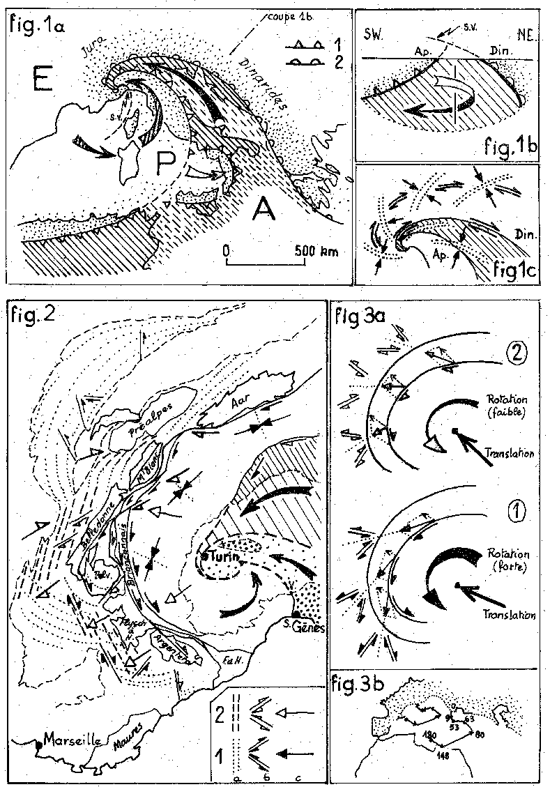 c. L'étirement des masses entrainées vers l'axe du tourbillon semble également très apparent dans le dispositif alpino-apenninique (où l'on peut localiser un point de convergence situé aux abords sud de Turin). Ayant particulièrement étudié l'effilement de la zone briançonnaise dans les Alpes graies à l'Ouest de Cuneo, je puis préciser que celui-ci est apparemment dû au jeu des fractures longitudinales, ici nord-ouest- sud-est, et qu'il n'y a là (contrairement à un modèle proposé par H. P. Laubscher) aucun indice de déplacements sénestres est-ouest lors de la tectonisation. Enfin, il faut sans doute souligner que c'est précisément dans ce secteur que s'accentue le mouvement de chevauchement vers l'Est du domaine alpin par-dessus celui de la plaine du Pô, comme si le dernier passait sous le premier, en même temps que sous l'Apennin, disposition qui n'est pas sans évoquer la réunion des fronts chauds et froids et le décollement de la volute d'air chaud par rapport au sol dans le modèle météorologique .