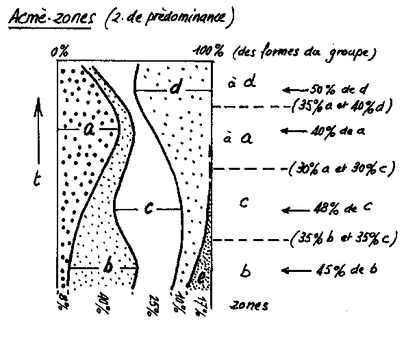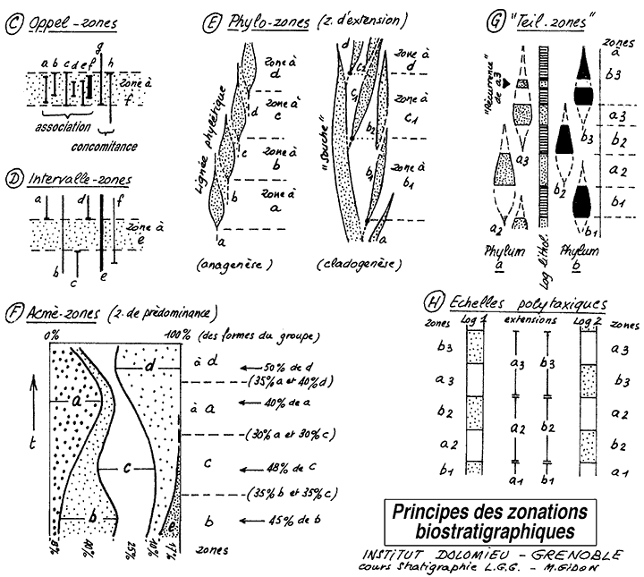 - conception biostratigraphique, sous l'influence du développement de la biostratigraphie (1920 à 1960) : l'outil majeur est la zone et l'étage ne peut pratiquement être conçu que comme un groupe de zones. Dans le souci d'aboutir à des étages standard on tend alors à choisir des limites qui correspondent à des événements évolutifs dans un aussi grand nombre que possible de groupes paléontologiques biostratigraphiquement utilisables.
