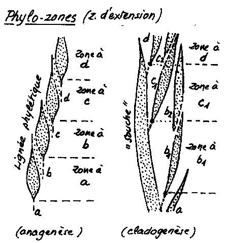 · variations de population liées aux provinces (populations différentes pour de mêmes biotopes en raison d'un isolement topographique ou climatique). A ce point de vue l'exemple type est celui des "étages alpins" du Trias (Anisien etc.) et du Jurassique et du Crétacé inférieur (Tithonique et Berriasien)