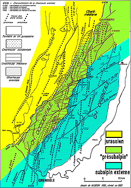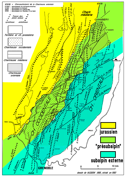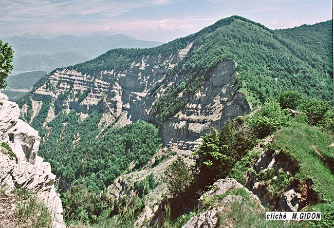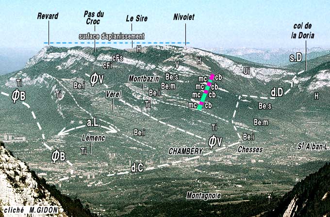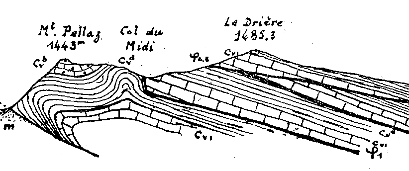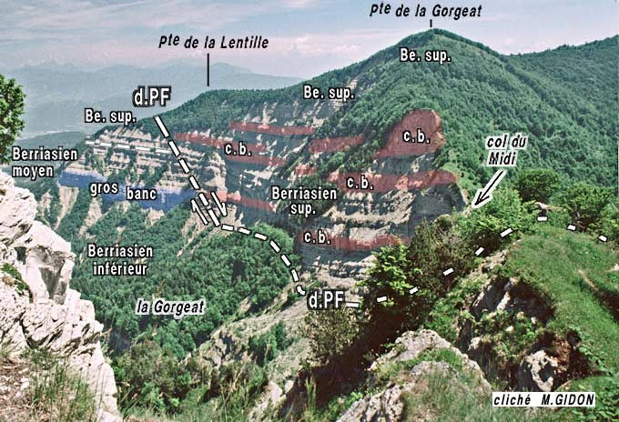 Paul Gidon cartographia soigneusement ces deux types de niveaux (sur les fonds topographiques au 1/20.000° en cours de parution). Ce faisant il constata leur terminaison latérale en biseau et le fait que, en plusieurs points, le changement de faciès s'y produisait souvent brutalement, avec des limites nettes, constituées par des surfaces obliques au couches ondulées et striées. Il en déduisit qu'il s'agissait là de surfaces de failles à faible pendage (failles "inverses") et imagina alors un dispositif d'écailles imbriquées (P.GIDON, 1951 et 1968).