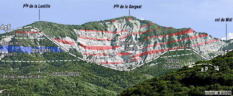 Dans les deux cas la succession des couches s'y caractérise, comme plus au sud dans les chaînons de la Chartreuse médiane et occidentale, par l'absence des marnes de Narbonne et par l'invasion vers le bas des faciès des calcaires du Fontanil, qui y forment plusieurs barres rocheuses étagées dans la pente (la succession y ressemble finalement beaucoup à celle de la coupe du Fontanil, surtout au Nivolet).