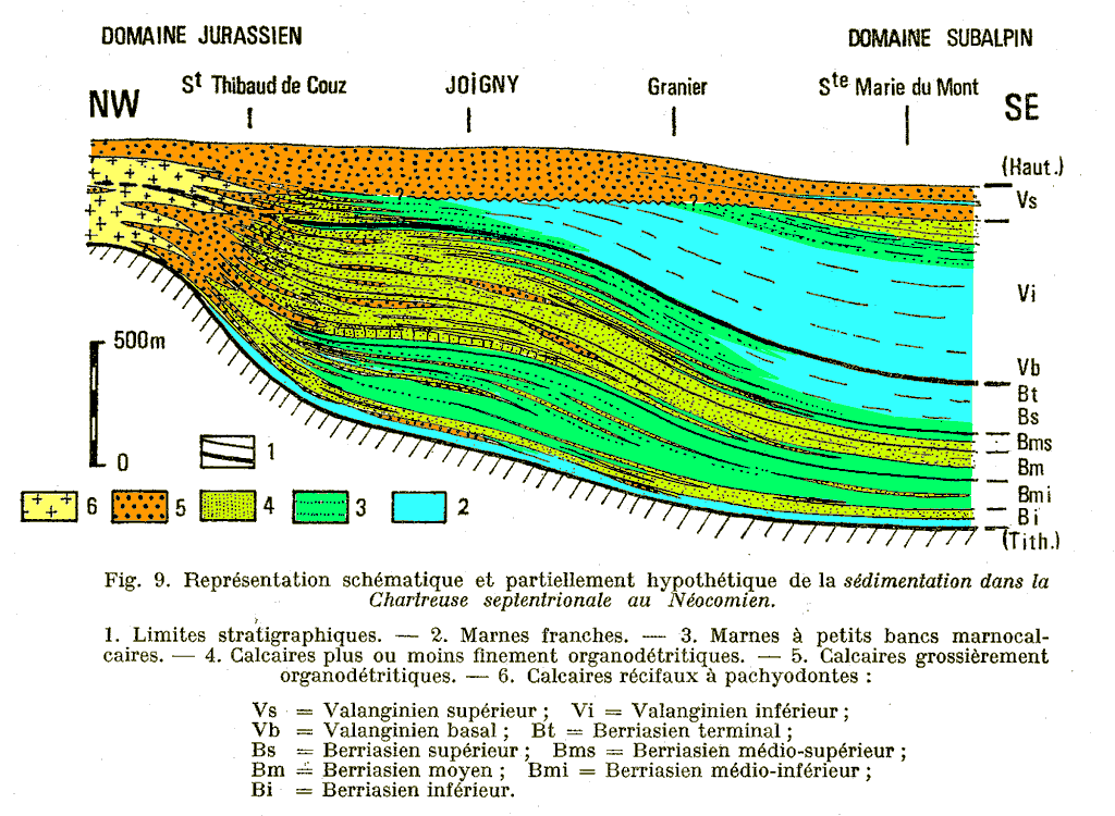 On trouvera ci-après deux schémas, publiés en 1966, illustrant l'analyse stratigraphique de la succession berriasienne du secteur du Mont Joigny ainsi que l'interprétation paléogéographique proposée alors (pour des données complémentaires plus précises concernant les documents paléontologiques et la description des coupes de référence on se reportera à la publication n° 039):