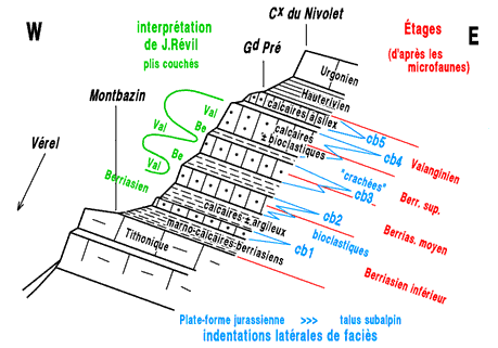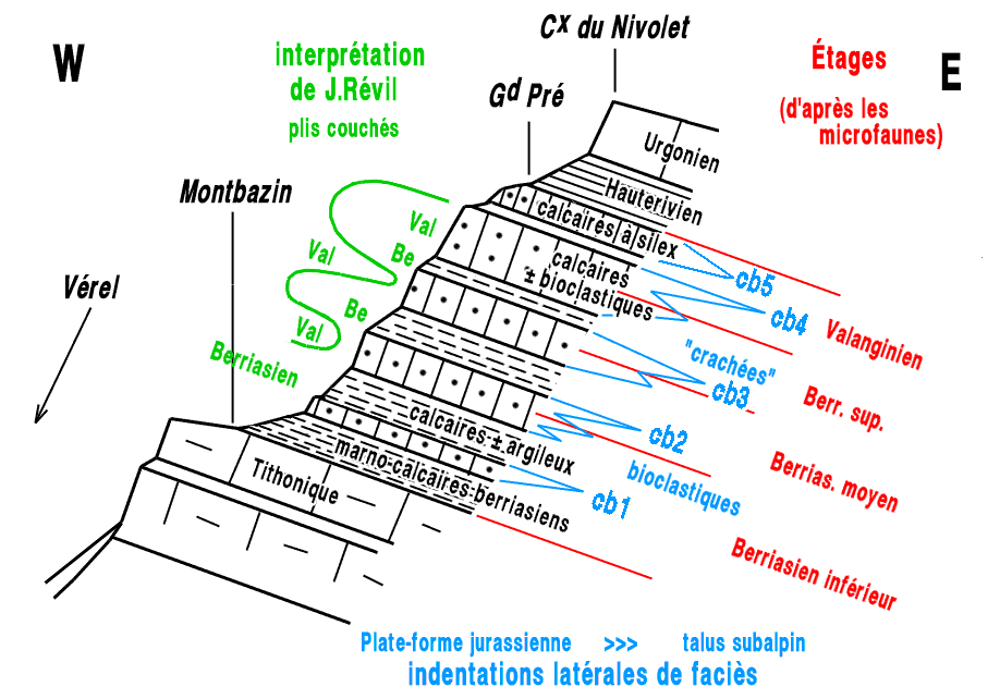 Au début du XXe siècle Joseph Révil avait reconnu dans les pentes du Nivolet cette alternance de faciès. Il avait alors considéré que chaque niveau de calcaires bioclastiques appartenait au Valanginien, car avait le faciès, "caractéristique" de cet âge (celui des calcaires du Fontanil). Il imagina donc, d'une façon assez abstraite, un système de plis couchés (il éprouva d'ailleurs une certaine peine à dessiner les raccords entre ces plis supposés et n'y arriva qu'au prix de quelques maladresses graphiques...).
